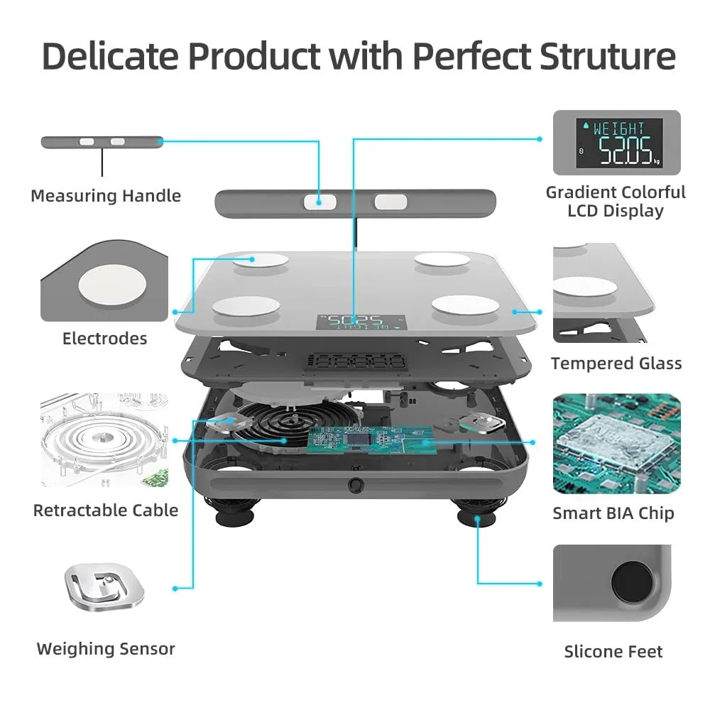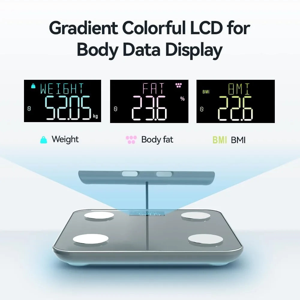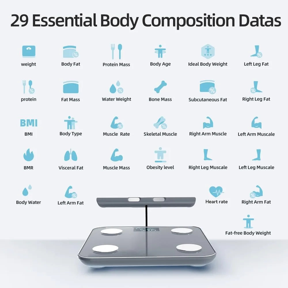- 29 Essential Body Composition Analyzer: Utilizing Bio-electrical Impedance Analysis (BIA), this scale calculates 28 essential body metrics, including Weight, BMI, Body Fat, Fat-free Body Weight, Subcutaneous Fat, Heart Rate, Heart Index, Visceral Fat, Body Water, Skeletal Muscle, Muscle Mass, Bone Mass, Protein, BMR, and Body Age. It's an ideal tool for tracking weight loss and maintaining a healthy lifestyle.
